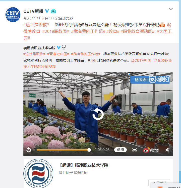 中国教育电视台官方微博转发我院微博“这才是职教”rap短视频