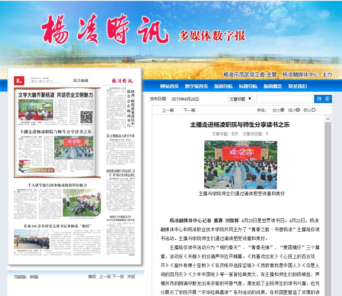 (杨凌融媒体中心记者 鹿赛 刘智辉)4月23日是世界读书日。4月22日,杨凌融媒体中心和杨凌职业技术学院共同主办了“青春之歌·书香杨凌”主播陪你读书活动。主播与学院师生们通过诵读感受诗意和美好。