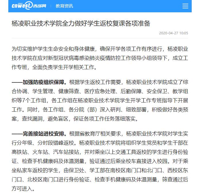 【西部网】杨凌职业技术学院全力做好学生返校复课各项准备