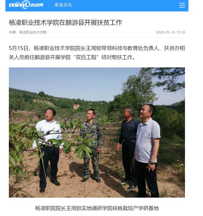 5月15日,杨凌职业技术学院院长王周锁带领科技与教育处负责人、扶贫办相关人员前往麟游县开展学院“双百工程”结对帮扶工作。