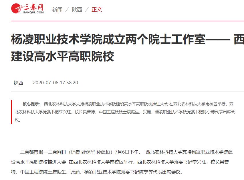 三秦都市报—三秦网讯(记者 薛保华 孙建恒)7月6日下午,西北农林科技大学支持杨凌职业技术学院建设高水平高职院校推进大会 在西北农林科技大学南校区举行。西北农林科技大学党委书记李兴旺,校长吴普特,中国工程院院士康振生、张涌,杨凌职业技术学院党委书记陈宁等代表出席会议。