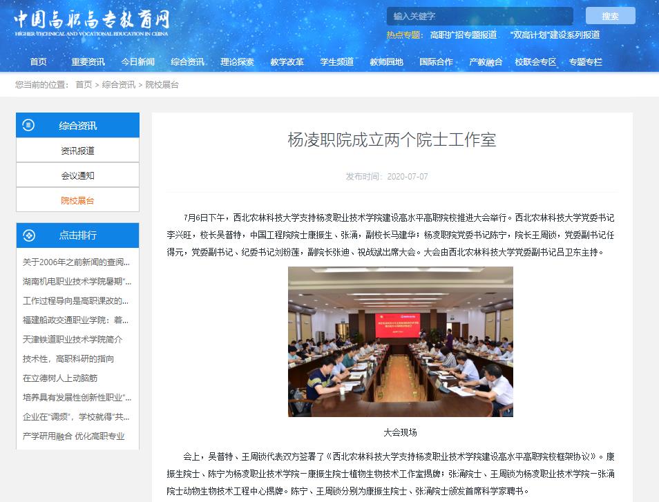 会上,吴普特、王周锁代表双方签署了《西北农林科技大学支持杨凌职业技术学院建设高水平高职院校框架协议》。康振生院士、陈宁为杨凌职业技术学院—康振生院士植物生物技术工作室揭牌;张涌院士、王周锁为杨凌职业技术学院—张涌院士动物生物技术工程中心揭牌。陈宁、王周锁分别为康振生院士、张涌院士颁发首席科学家聘书。