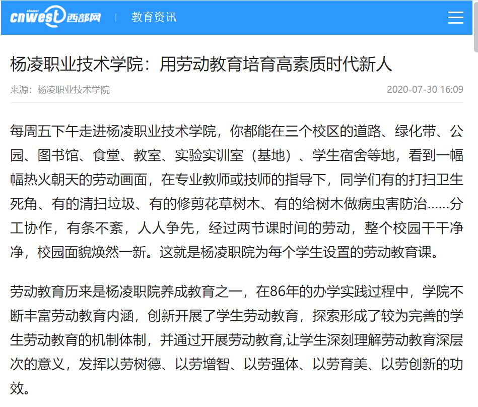 劳动教育历来是杨凌职院养成教育之一,在86年的办学实践过程中,学院不断丰富劳动教育内涵,创新开展了学生劳动教育,探索形成了较为完善的学生劳动教育的机制体制,并通过开展劳动教育,让学生深刻理解劳动教育深层次的意义,发挥以劳树德、以劳增智、以劳强体、以劳育美、以劳创新的功效。
