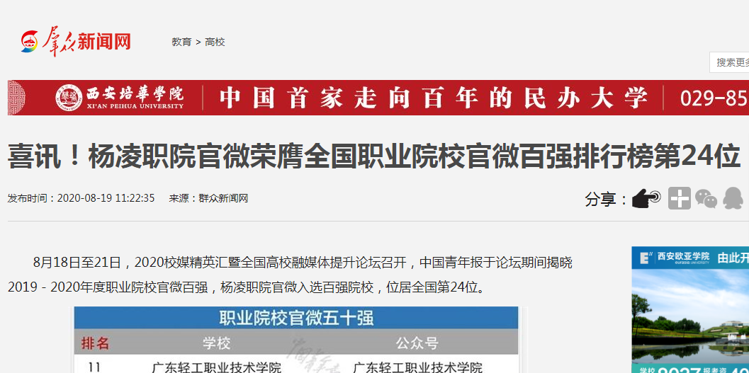 8月18日至21日,2020校媒精英汇暨全国高校融媒体提升论坛召开,中国青年报于论坛期间揭晓2019-2020年度职业院校官微百强,杨凌职业技术学院官微入选百强院校,位居全国第24位。
