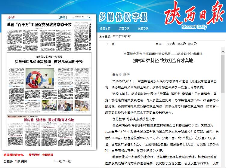 建校86年来,杨凌职院始终围绕“经国本 解民生 尚科学”的办学理念,坚定不移地走内涵式发展道路,育人质量全面提高,办学特色更加凸显,综合实力不断增强,是国家首批示范性高等职业院校、国家优质专科高等职业院校、陕西省一流高职院校和中国特色高水平高职学校建设单位。