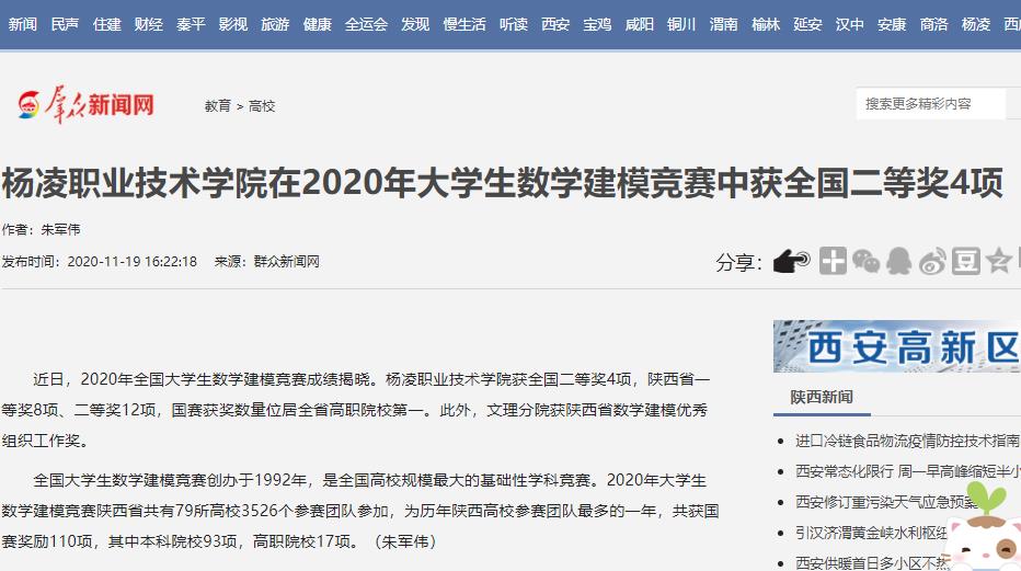 【群众新闻网】杨凌职业技术学院在2020年大学生数学建模竞赛中获全国二等奖4项