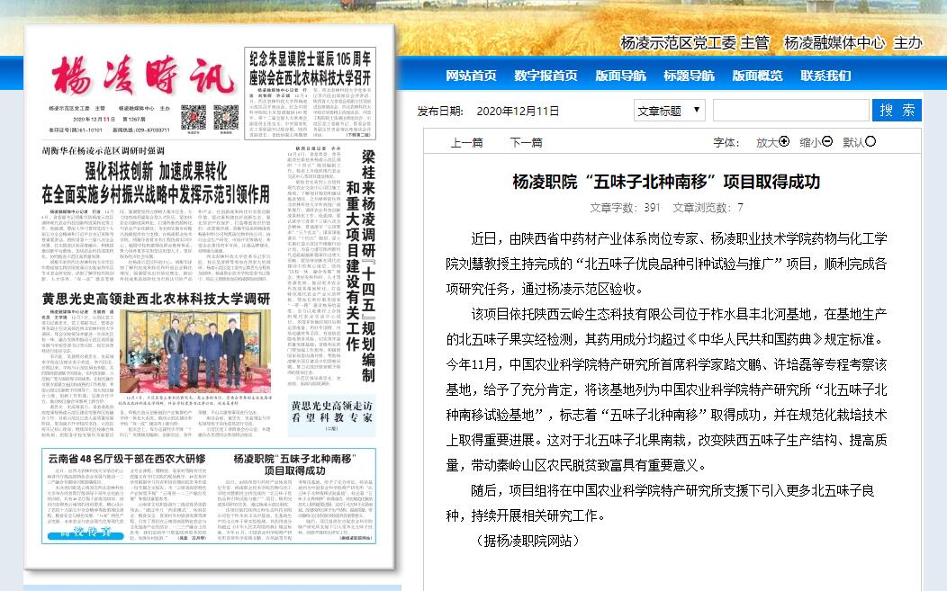 近日,由陕西省中药材产业体系岗位专家、杨凌职业技术学院药物与化工学院刘慧教授主持完成的“北五味子优良品种引种试验与推广”项目,顺利完成各项研究任务,通过杨凌示范区验收。