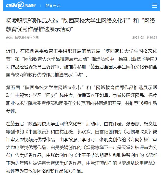 【西部网】杨凌职院9项作品入选“陕西高校大学生网络文化节”和“网络教育优秀作品推选展示活动”