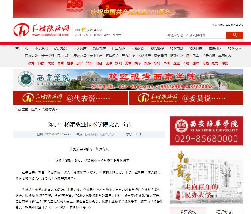 【和谐陕西网】在党史学习教育中铸魂育人——访陕西省政协委员、杨凌职业技术学院党委书记陈宁