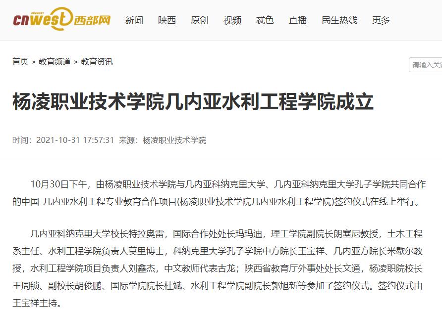10月30日下午,由杨凌职业技术学院与几内亚科纳克里大学、几内亚科纳克里大学孔子学院共同合作的中国-几内亚水利工程专业教育合作项目(杨凌职业技术学院几内亚水利工程学院)签约仪式在线上举行。