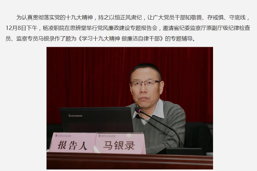 为认真贯彻落实党的十九大精神,持之以恒正风肃纪,让广大党员干部知敬畏、存戒惧、守底线,12月8日下午,杨凌职院在思辨堂举行党风廉政建设专题报告会,邀请省纪委监察厅原副厅级纪律检查员、监察专员马银录作了题为《学习党的十九大精神 做廉洁自律干部》的专题辅导。