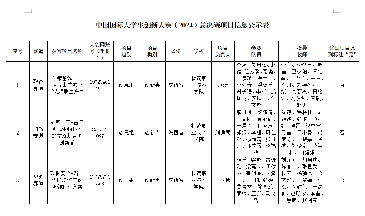 根据关于报送中国国际大学生创新大赛(2024)总决赛项目的通知的相关要求,我校邀请了省内外专家对 7 个省赛金奖项目进行评审,依据评审结果,推荐《羊精蓄锐——培育山羊繁育“芯”质生产力》(创意组)、《抗氧之王-基于合成生物技术的左旋虾青素创新者》(创意组)、《璇枢安全-新一代区块链主动防御解决方案》(创业组)3 个项目参加中国国际大学生创新大赛(2024)总决赛,现将参赛信息公示如下: