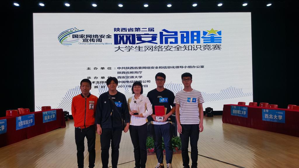 陕西省“网安启明星”大学生网络安全知识竞赛是由中共陕西省委网信办、陕西省教育厅主办的一项面向高校在校学生的全省性知识竞赛,本届比赛共有45个学校参赛,分三个赛区。我院经过精心组织、训练和选拔,组成了由孟庆珅、田枭、强逸凡和肖毅四名同学组织的代表队,由信息工程分院网络技术教研室刘维嘉老师担任指导老师。9月18日复赛中,在赛区15所高校中名列第二,我院为所有参赛队中唯一一个高职院校进入决赛。