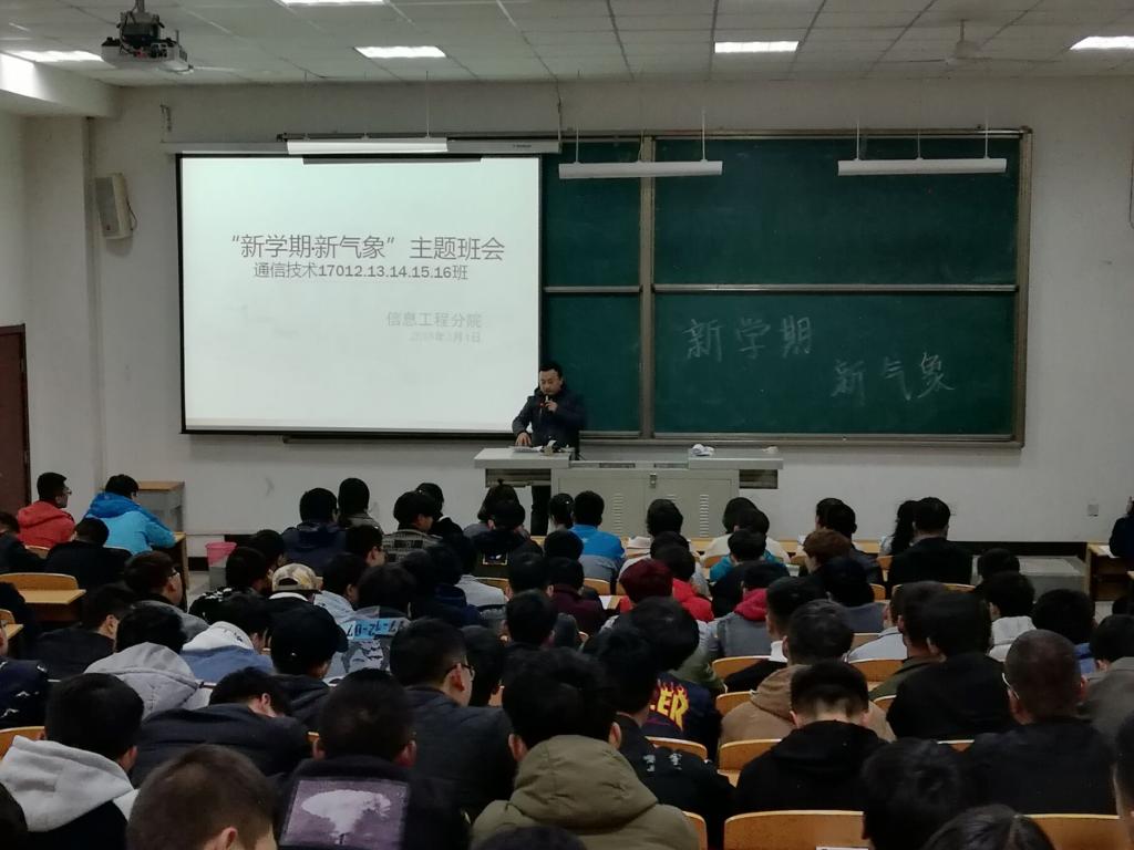 根据学院2018年3月3日上午召开的2018年工作会议精神,为认真落实 3月4日召开的信息工程分院2017-2018学年第二学期全体职工大会以及3月3日下午召开信息工程分院2017-2018学年第二学期辅导员班主任会议精神,信息工程分院3月4日晚自习期间在南北校区分别召开了2016级、2017级“新学期、新气象主题班会”
