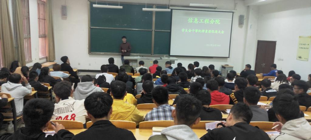 为进一步加强学生干部队伍建设,强化学生干部纪律意识,提升学生干部工作水平,2019年10月18日,信息工程分院在北校区BOA-118教室举办学生干部纪律促进会。信息工程分院全体学生干部参加了会议,培训会由学生会主席刘双磊主持,学生工作办公室张齐老师出席了会议。