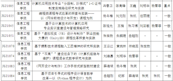 近期, 2021年校内教育教学改革研究项目下达,我院教师获批项目8项。其中,冯春卫老师主持的《计算机应用技术专业“分段制、阶梯式”1+X证书制度实施路径研究与实践》项目,获批为重点项目;杨冬梅老师主持的《编程类课程考试改革的探索与实践——以<网站前端设计与开发>课程为例》等7个项目,获批为一般项目。