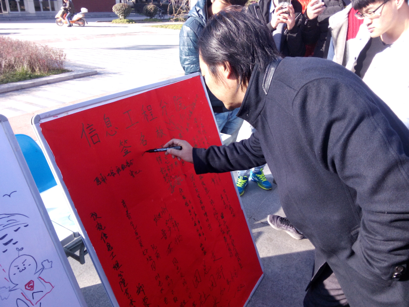 2015年12月16日,告别多日雾霾,终于迎来灿烂的阳光。由校团委、校书画艺术中心主办,信息工程分院团总支承办的二〇一五年“十大节庆—新年之约”之“多彩青春·欢乐校园”大型艺术展在南校区文化广场盛大举行。