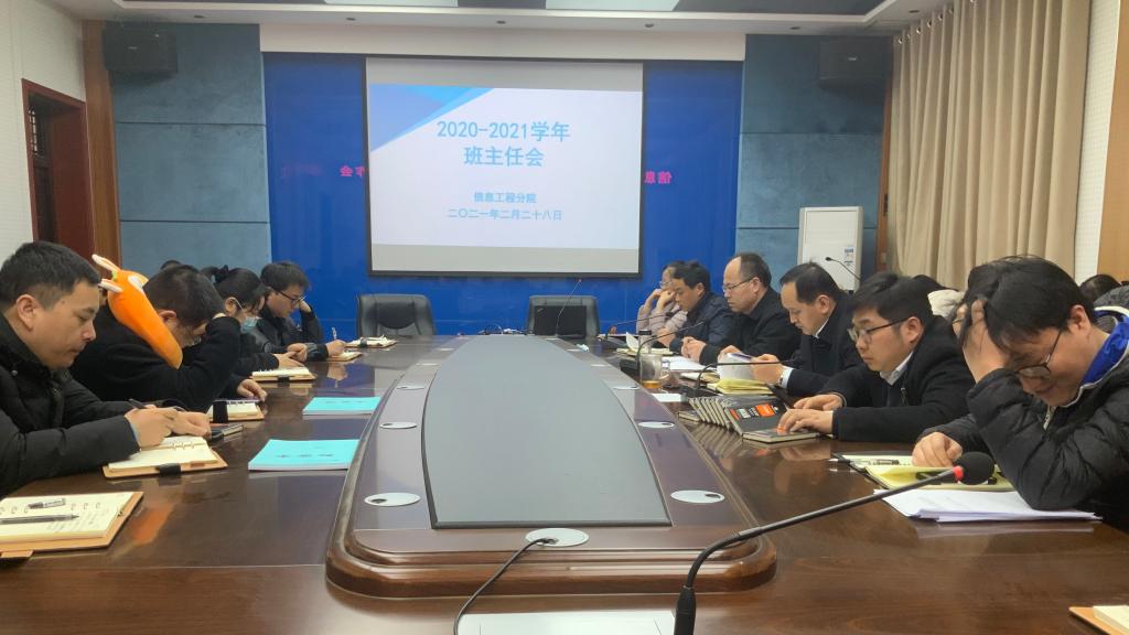 2月28日下午,信息工程分院于秦风楼党员活动室召开2020-2021年第二学期班主任会,分院副书记吴高潮、副院长陈高锋、学工办主任任争峰、全体辅导员和班主任参加会议。